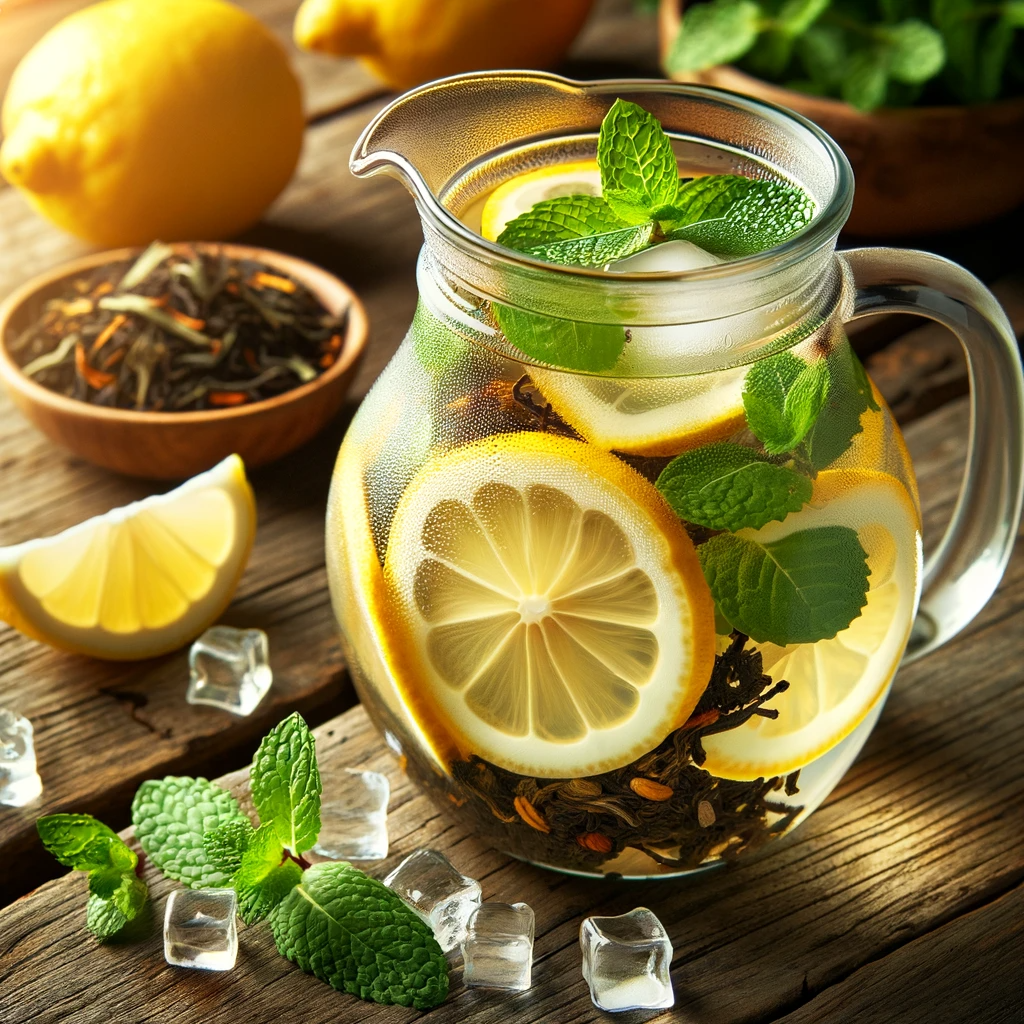 보이차를 우려내고 식힙니다. 큰 유리병에 보이차를 붓습니다. 레몬 슬라이스와 민트 잎을 추가합니다. 얼음을 넣고 잘 저어줍니다. 냉장고에 1-2시간 두었다가 마십니다.