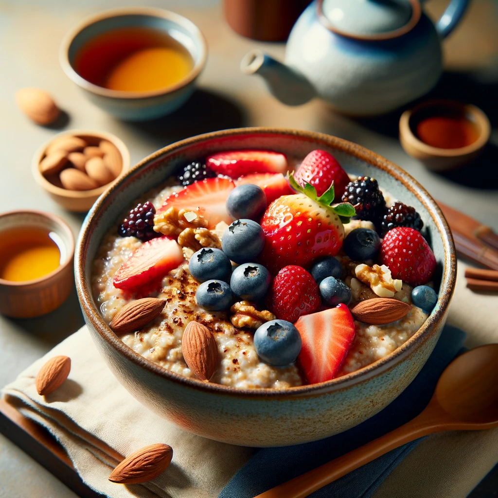 보이차 1잔 (뜨거운) 오트밀 1/2컵 과일 (딸기, 블루베리 등) 몇 개 견과류 (아몬드, 호두 등) 소량 꿀 또는 메이플 시럽 (선택 사항)