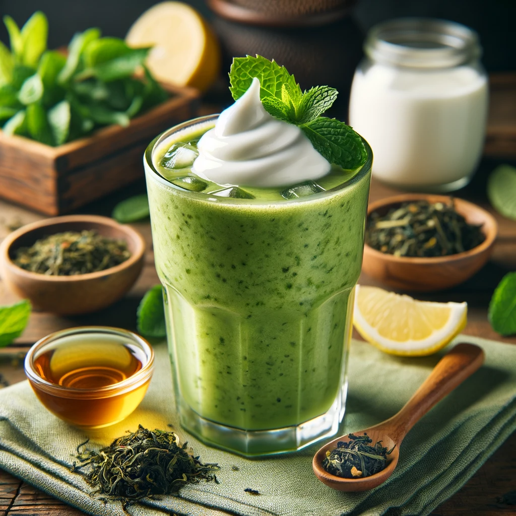 보이차 1잔 (차가운) 신선한 녹차 잎 1줌 얼음 조각 몇 개 플레인 요거트 1/2컵 꿀 1테이블스푼 (선택 사항)